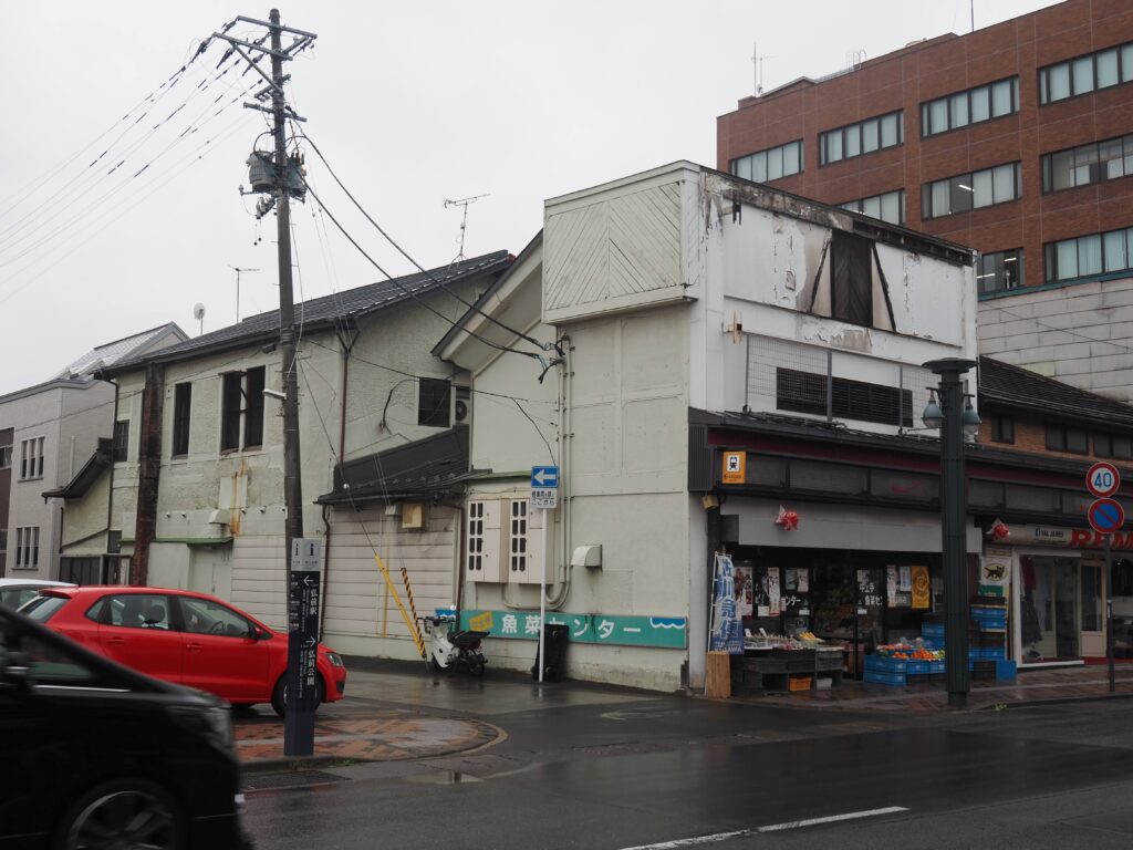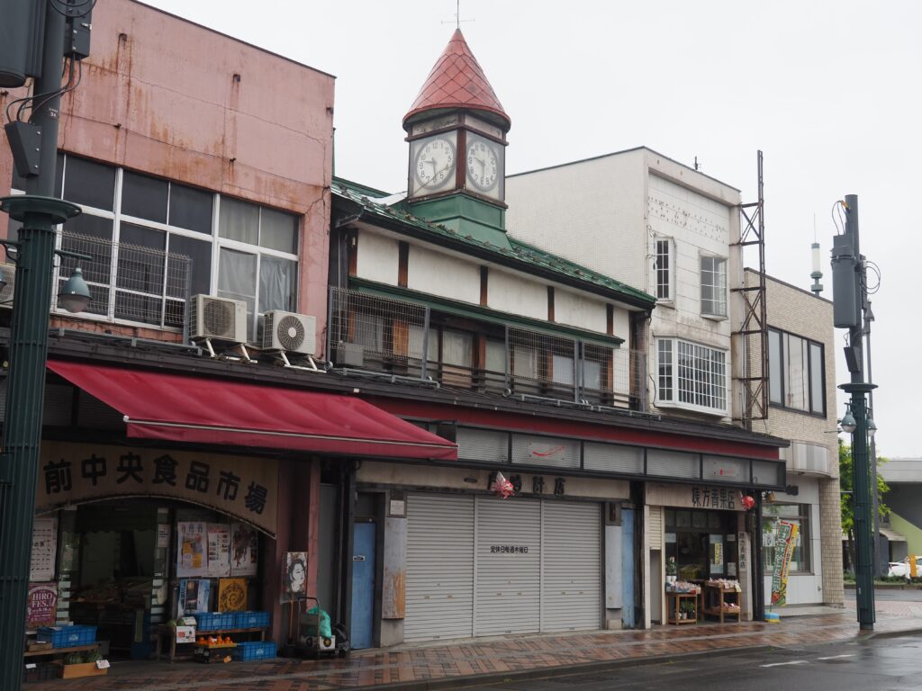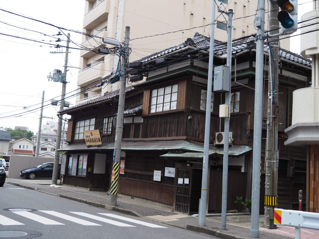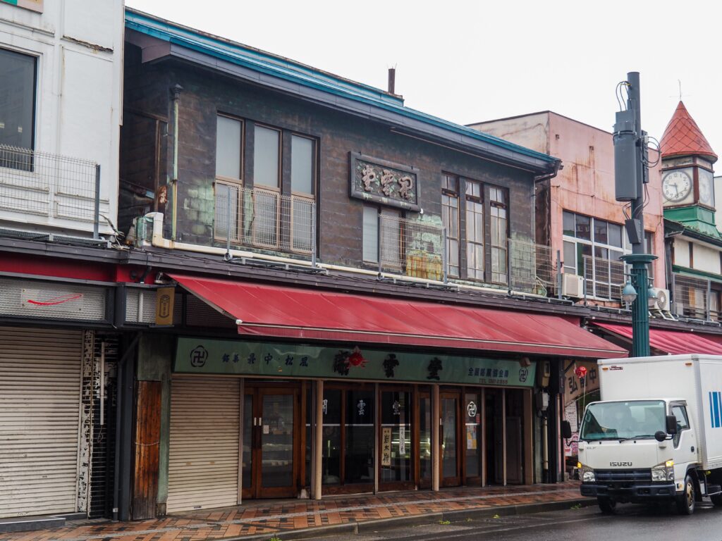 老舗和菓子店。2024年に閉店している。奥には一戸時計店が見える。
