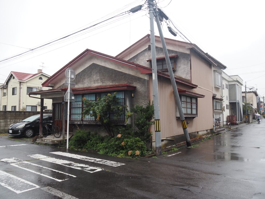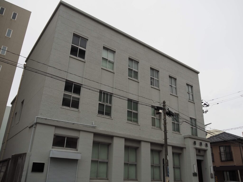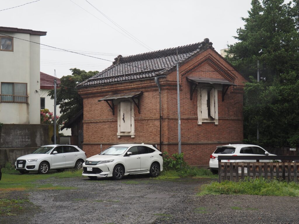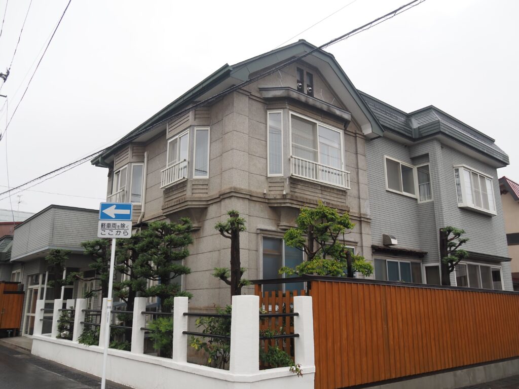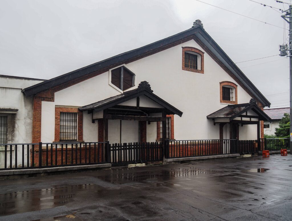 弘前駅近く。妻面は漆喰壁と見せかけて煉瓦の窓枠のモダンなデザインで、切妻屋根の本棟から横に生える形で洋風のモルタル塗りの事務所棟がついている。