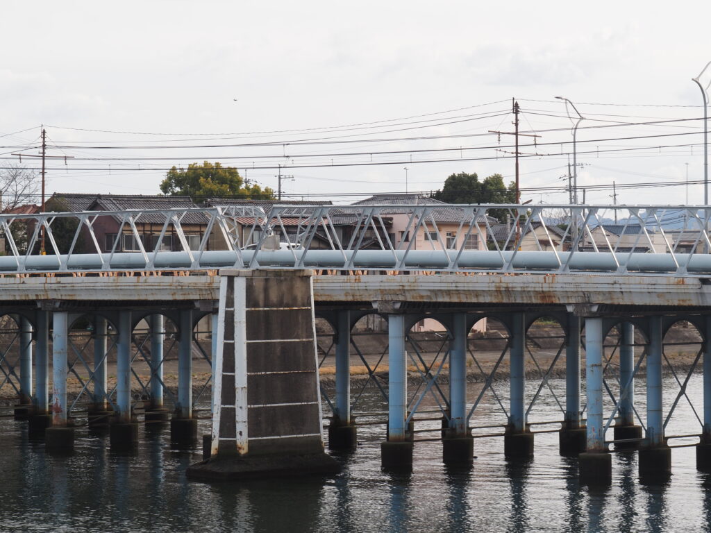 京橋と併置されている水道管。明治37年(1904)の完成で、岡山市は翌明治38年から上水道を開通しているので県内最初期の水道施設であるとともに、県内最古の鋼トラス橋、全国最古の鋼製水管橋である。この橋ができた頃は京橋は先 … 続きを読む