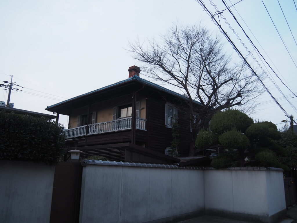 和洋折衷の文化住宅。洋館部分が大きい。国道沿いにあり目立つ。