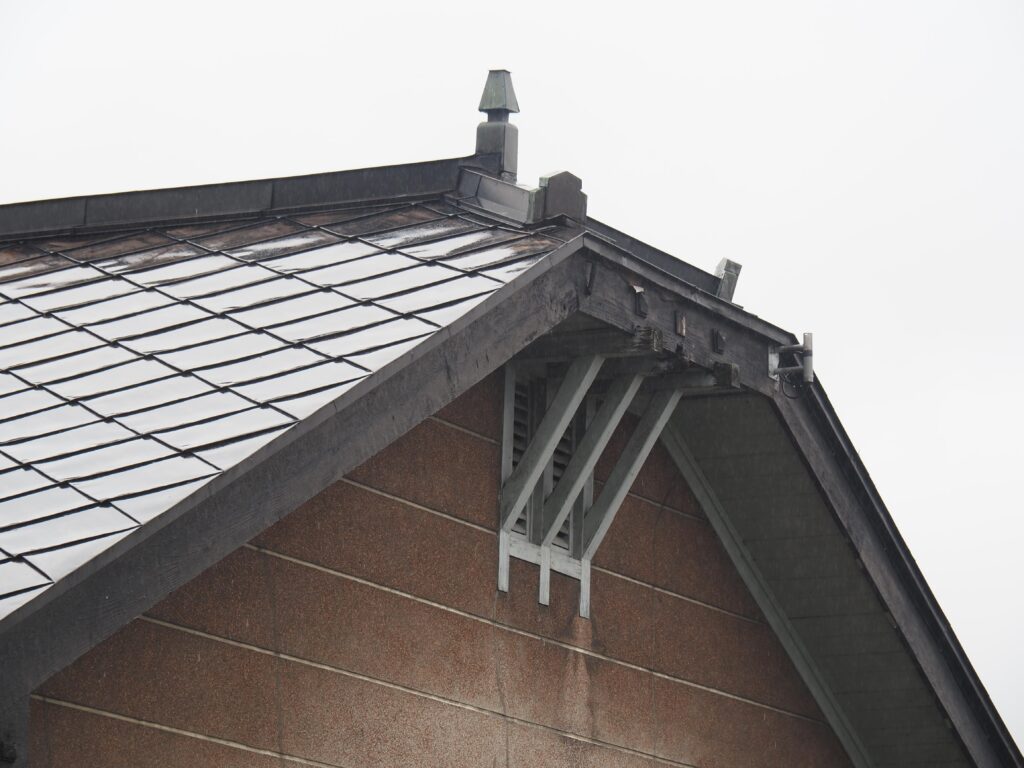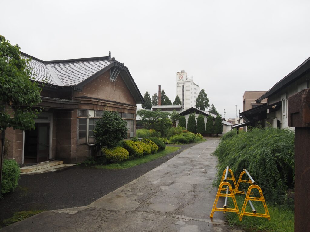弘前駅近く。妻面は漆喰壁と見せかけて煉瓦の窓枠のモダンなデザインで、切妻屋根の本棟から横に生える形で洋風のモルタル塗りの事務所棟がついている。
