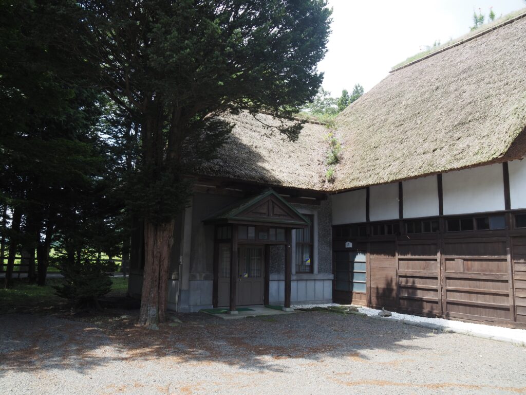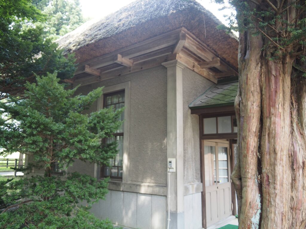 この建物は敷地内最古の施設で、茅葺き屋根に洋風のモルタル壁という全国でもかなり珍しい外観をしている。南部曲屋という地域独自の様式である。