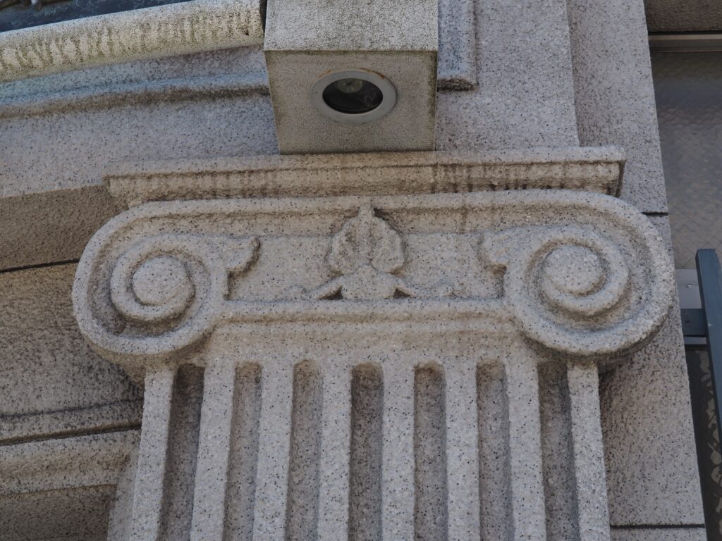 ネオルネサンス様式を基調にしながらイオニア式の柱で飾る。やや傾斜のある角張った土地にあるせいか、独特な形状になっている。