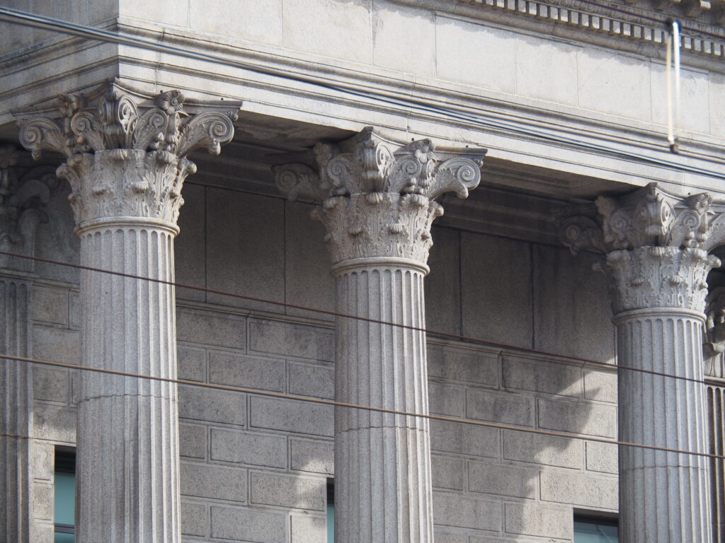 現ルネスホール。近代的な直方体の躯体に、やたら奥行の狭い4本のジャイアントオーダーとペディメントをもつ。コリント式のオーダーや波模様と御影石の外壁など見応え十分である。