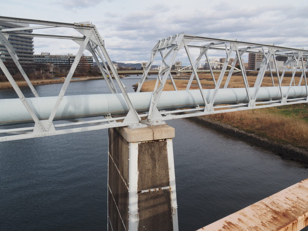 No.00314京橋水道管竣工年: 1904 用途: 土木, 橋梁, 水道施設 文化財: 国登録有形文化財 時代区分: 明治 現存有無: 現存 2026年2月19日 by iwatobi 京橋と併置されている水道管。明治37年(1904)の完成で、岡山市は翌明治38年から上水道を開通しているので県内最初期の水道施設であるとともに、県内最古の鋼トラス橋、全国最古の鋼製水管橋である。この橋ができた頃は京橋は先代の木造橋であった。明治期にコンクリートを用いてるのでそこもかなり初期の例である。 関連情報用途: 土木, 橋梁, 水道施設文化財: 国登録有形文化財時代区分: 明治現存有無: 現存竣工年: 1904