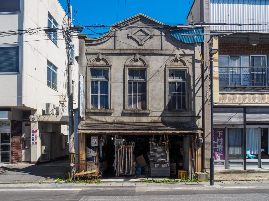 典型的な看板建築の作例。なぜか中心をやや外した窓の配置が可愛くて素敵である。
