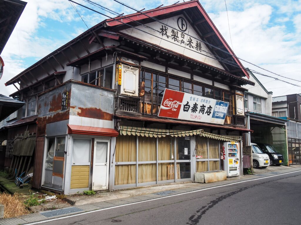 温湯温泉の入口付近にある商店。戸袋のモルタル装飾が立派である。かつてはここに屋号が書かれていたと思われる。
