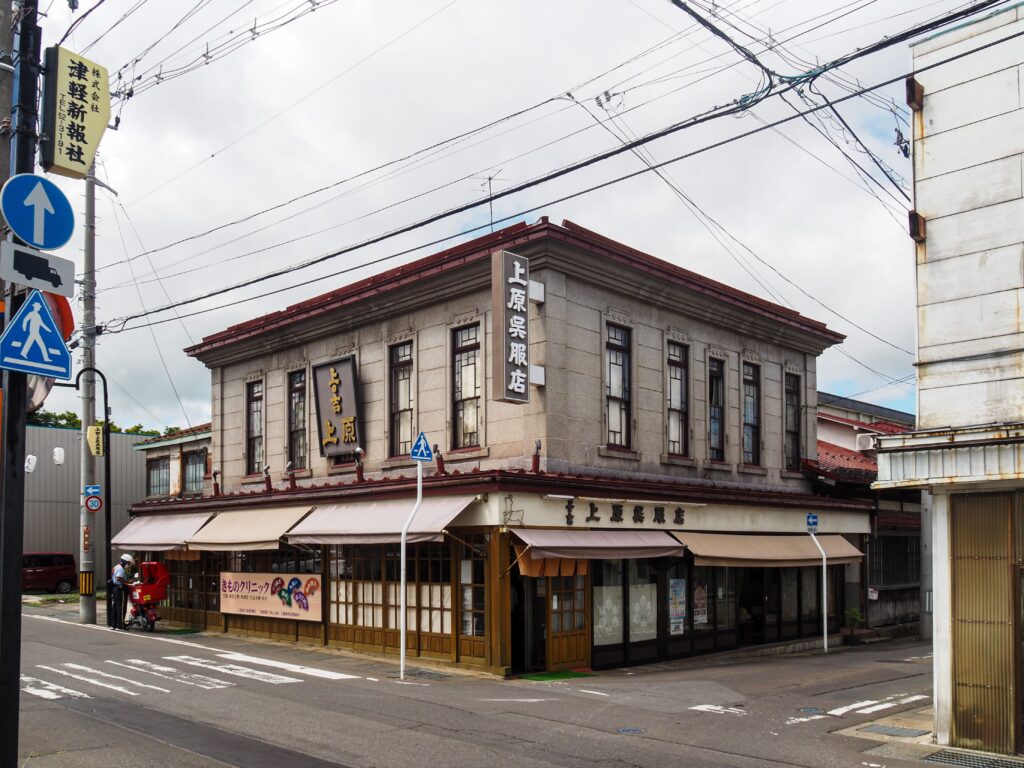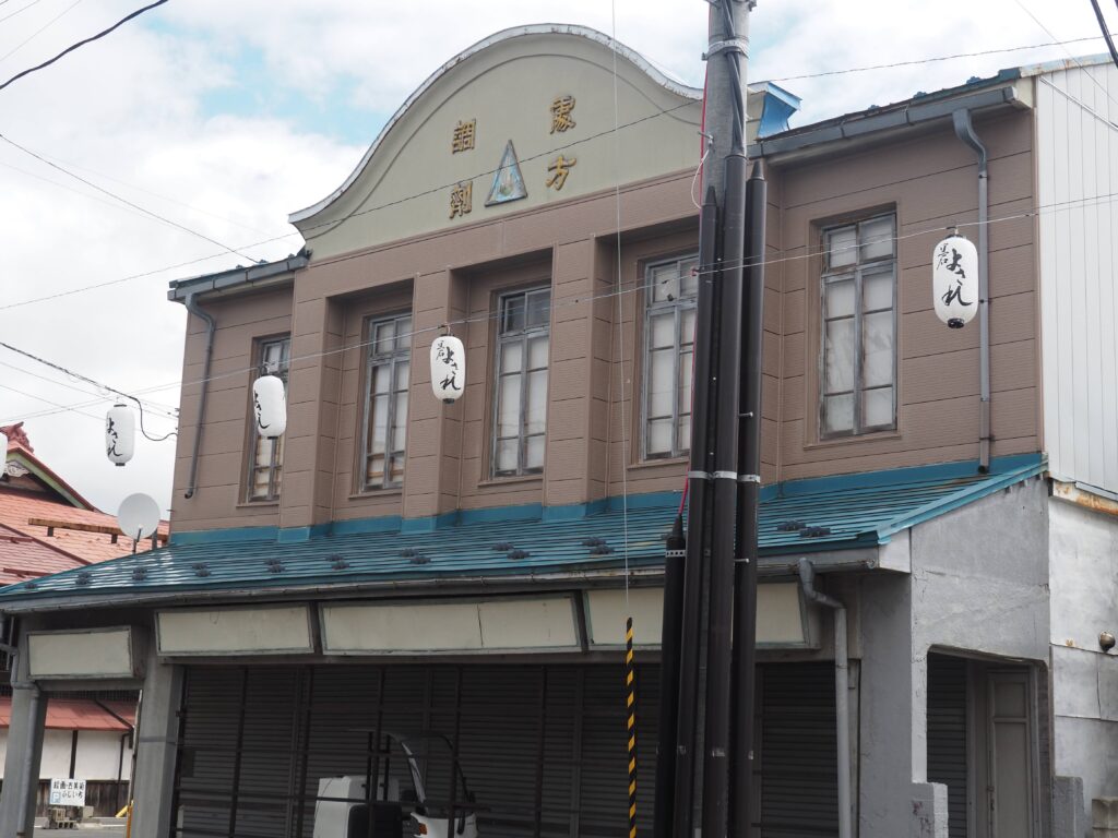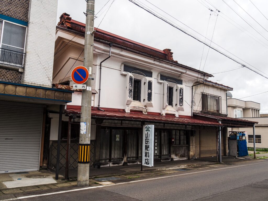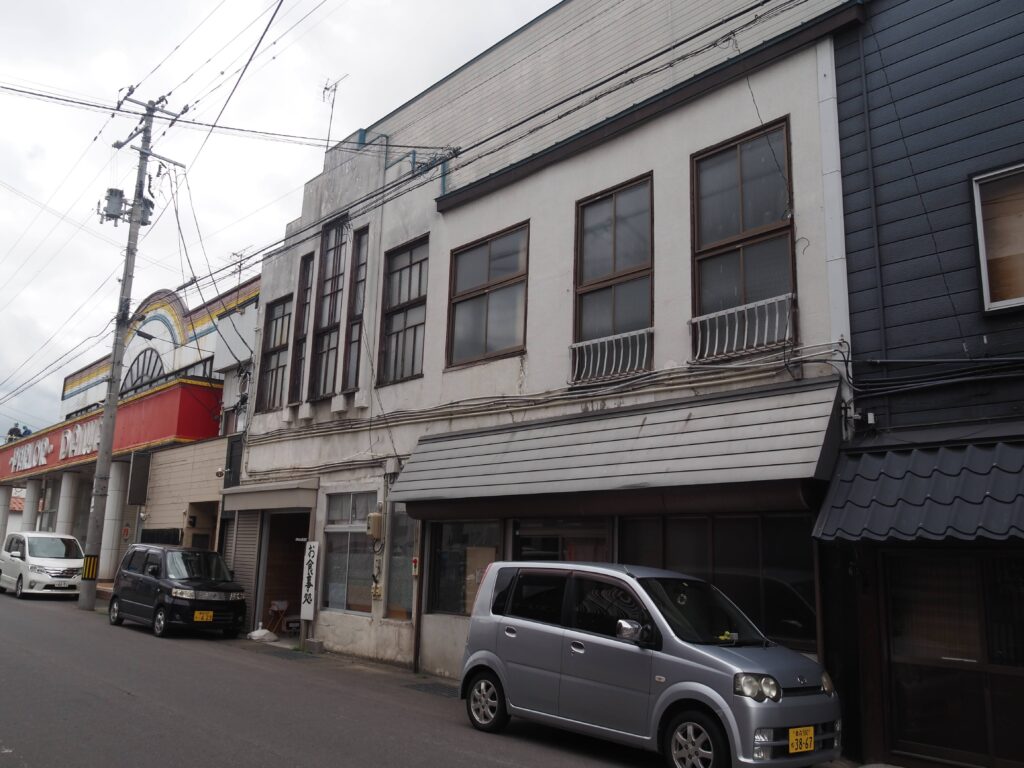 独特なカーブのパラペットを立ち上げた看板建築。こみせ通り(重伝建地区)のためか、こみせ付きである。