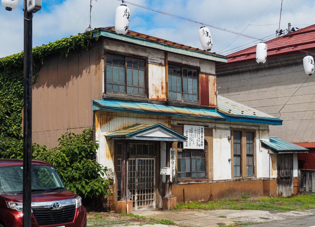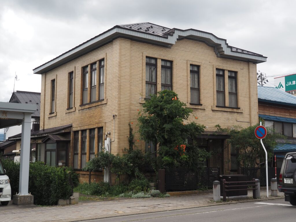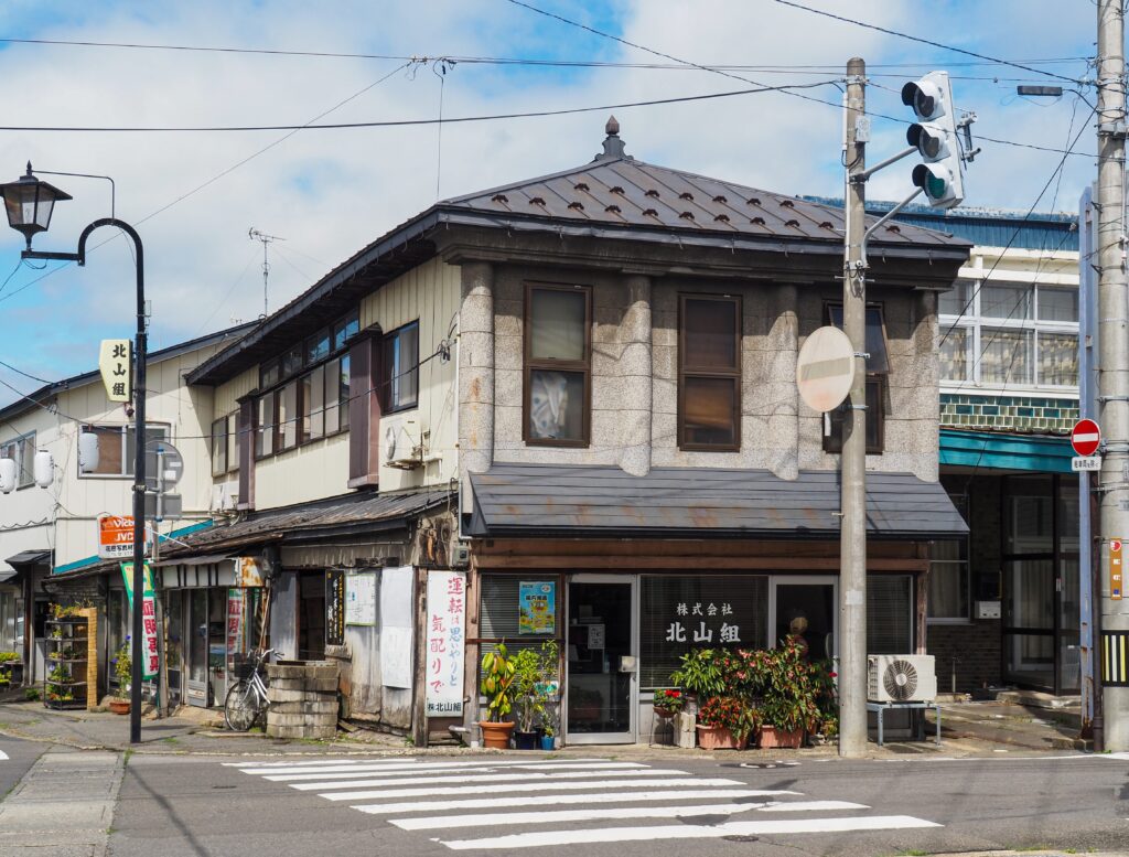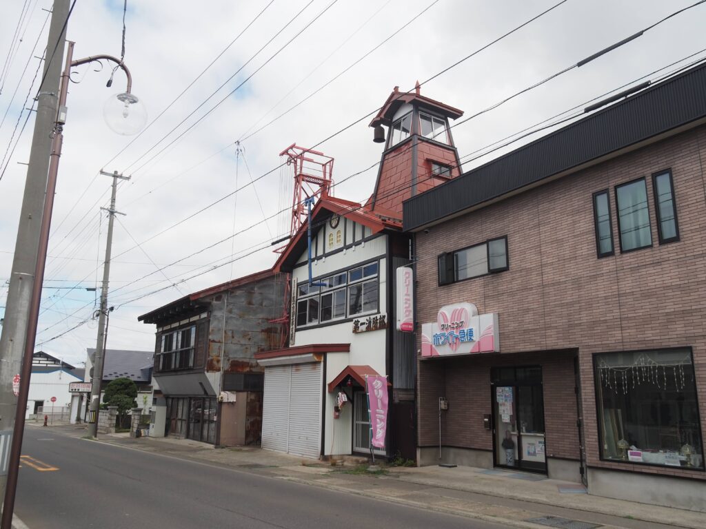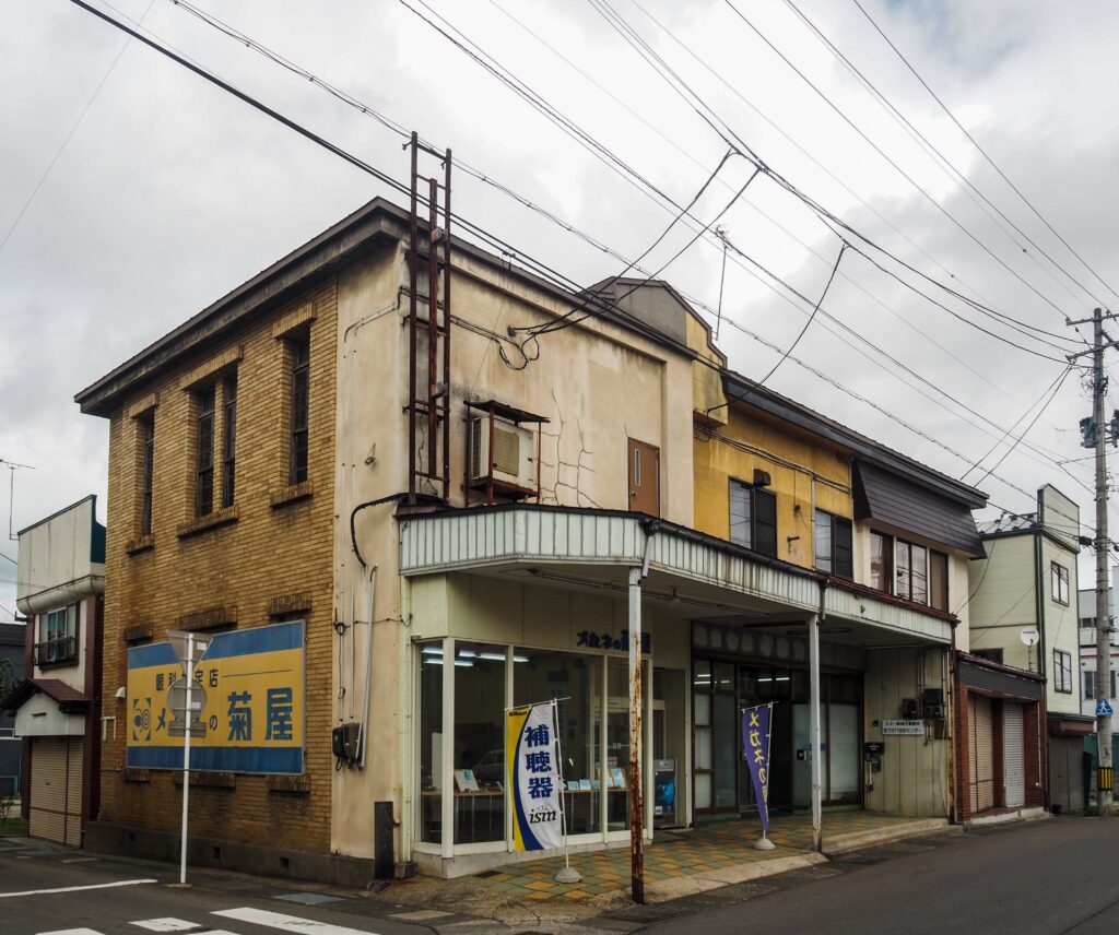 独特なカーブのパラペットを立ち上げた看板建築。こみせ通り(重伝建地区)のためか、こみせ付きである。