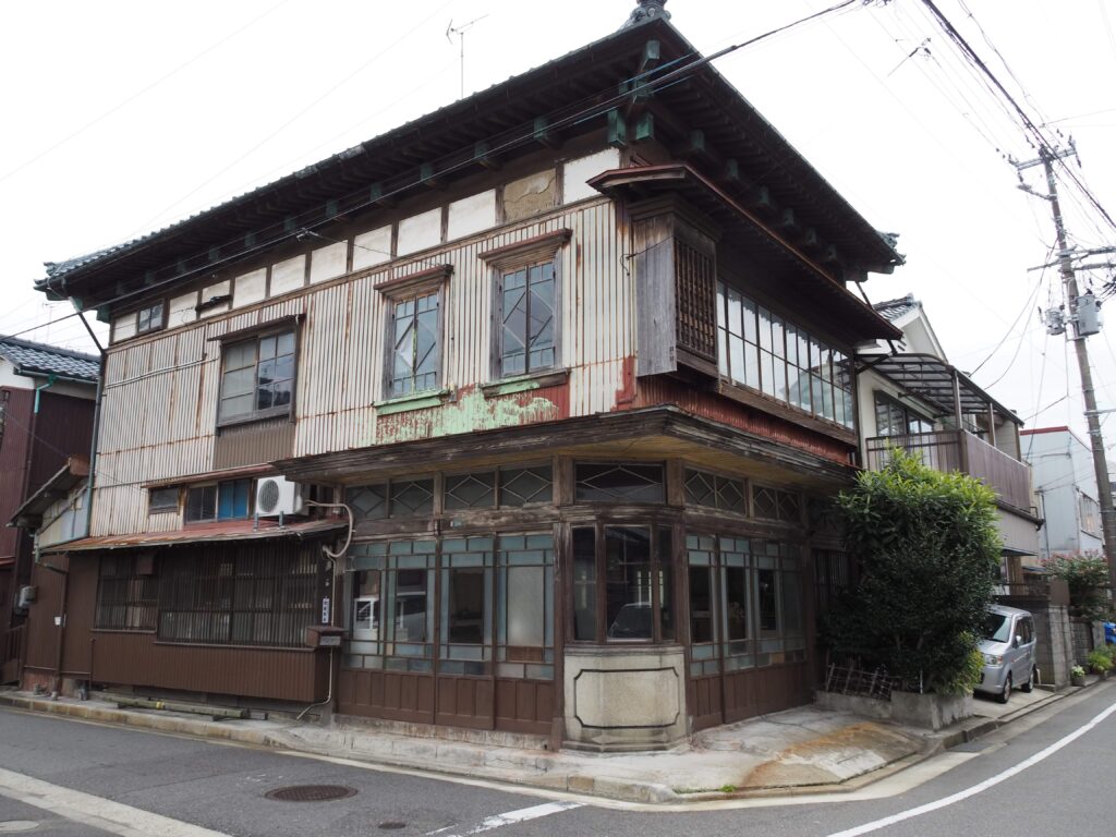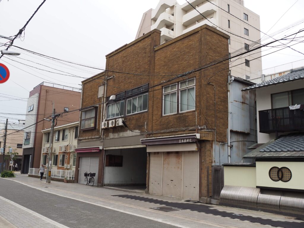 老舗和菓子店。2024年に閉店している。奥には一戸時計店が見える。