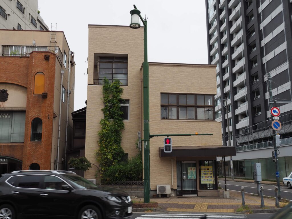 弘前駅近く。妻面は漆喰壁と見せかけて煉瓦の窓枠のモダンなデザインで、切妻屋根の本棟から横に生える形で洋風のモルタル塗りの事務所棟がついている。