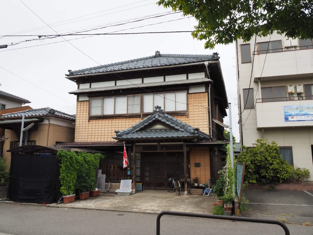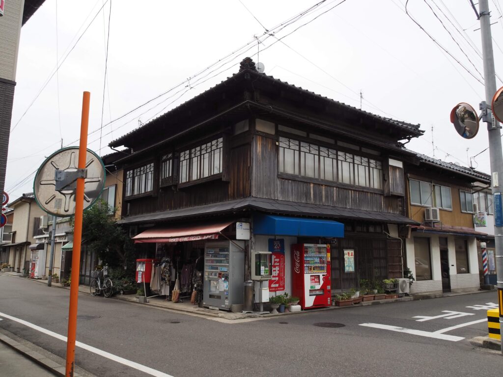 老舗和菓子店。2024年に閉店している。奥には一戸時計店が見える。