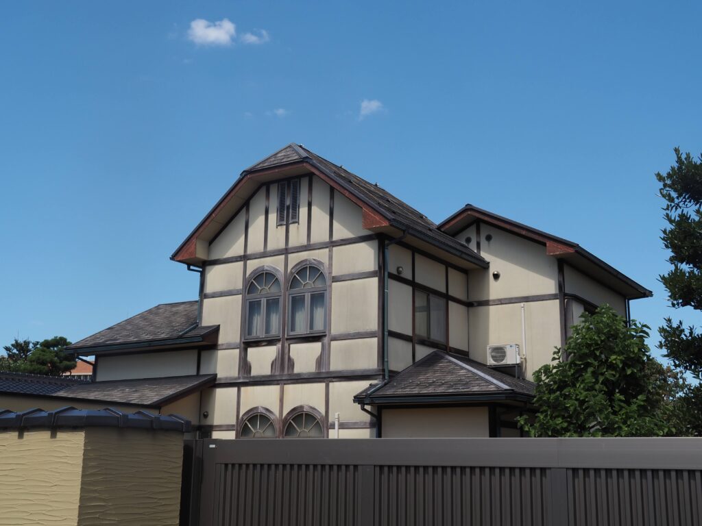 袴腰屋根に2連半円アーチ窓、ハーフティンバー調の外観の洋館。偶然見つけたもので詳細不明。